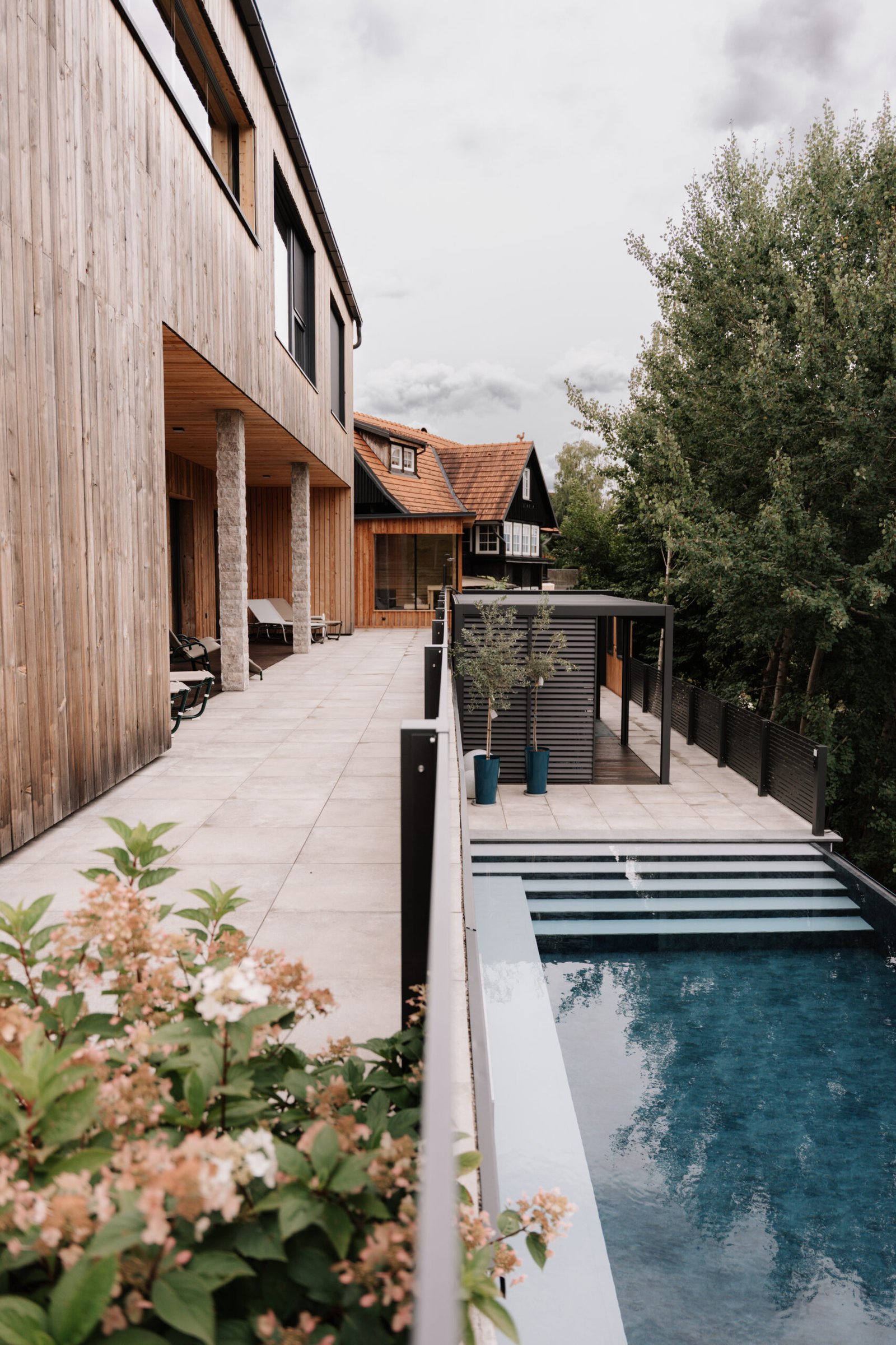 Infinity-Pool (8 x 4 m, 32 m²) mit atemberaubendem Blick auf die Weinberge und die Koralpe